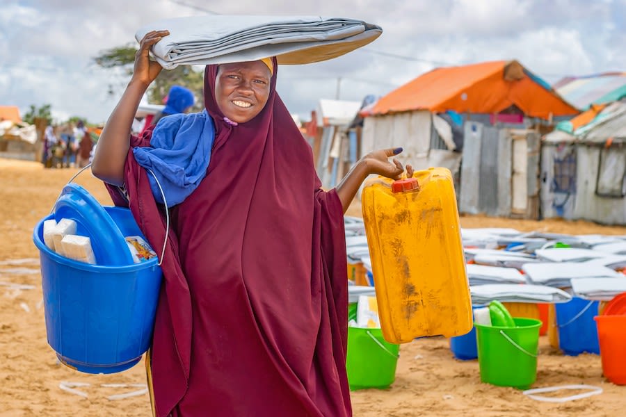 A woman in a displacement site in Baidoa carries non-food items. IOM 2022.