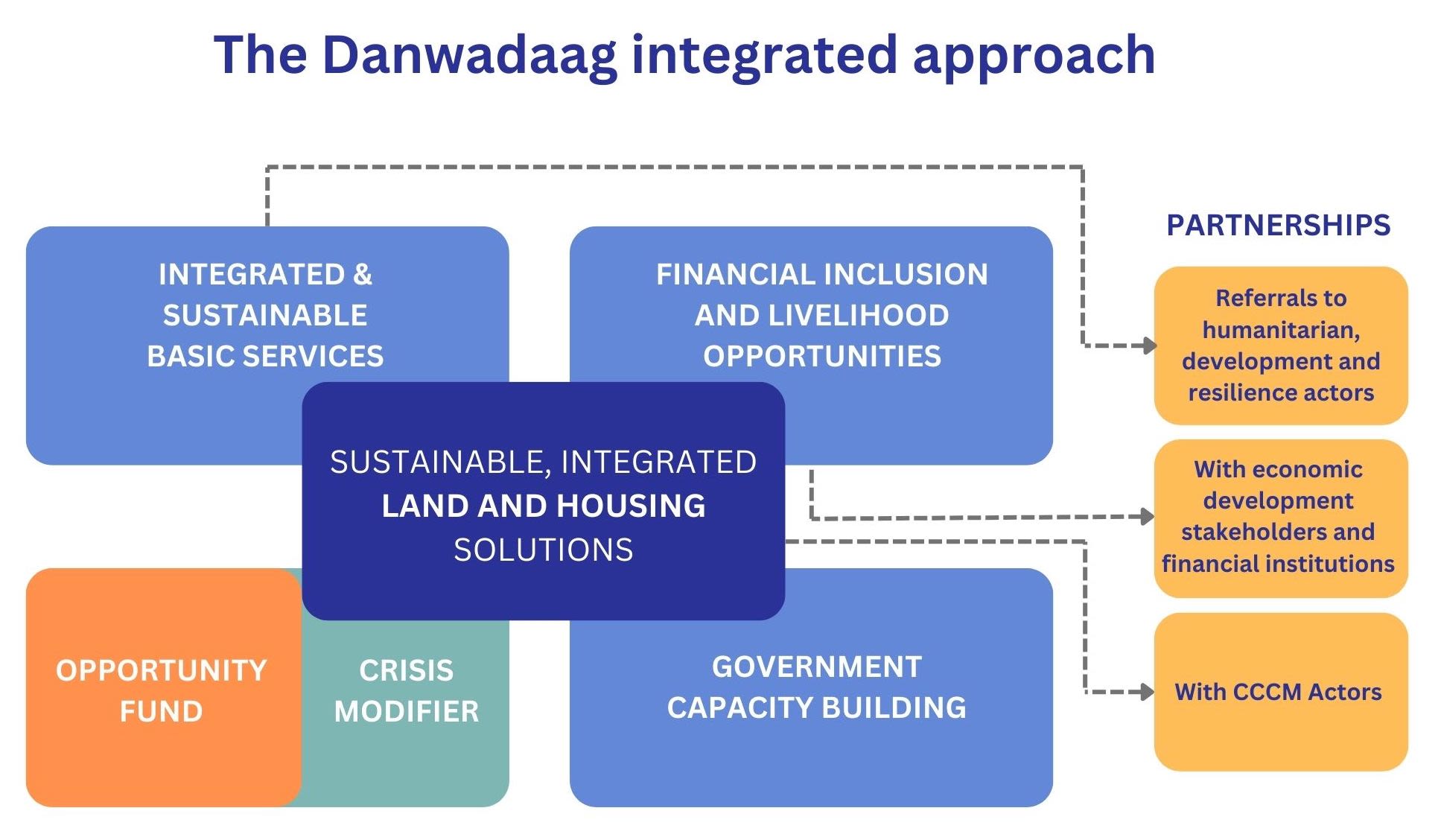 Since 2018, the Danwadaag Durable Solutions Consortium has been working to enhance durable solutions for and (re)integration of displacement-affected communities in Somalia by supporting government capacity building, delivering integrated sustainable basic services, empowering communities to claim their HLP rights, enhancing land tenure security, and promoting sustainable livelihoods. Danwadaag works in key urban centres across South West State, Banadir Regional Administration, Jubaland and Puntland.