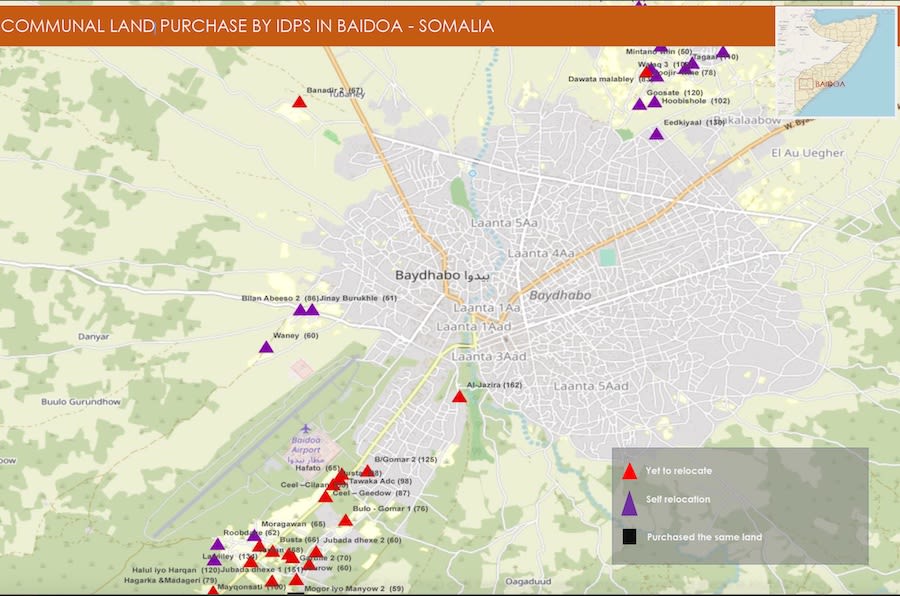 This mapping, conducted in 2021, identified 52 sites in Baidoa where the displaced bought land with communal contributions.