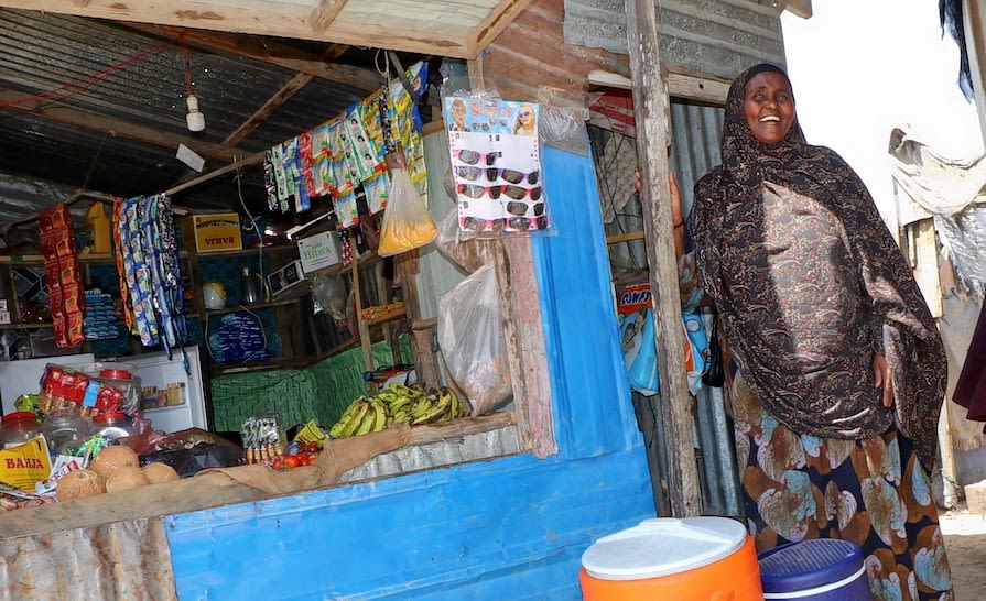 Khadijo stands in front of her market stall. Abdulkadir Mohamed/ NRC 2021.