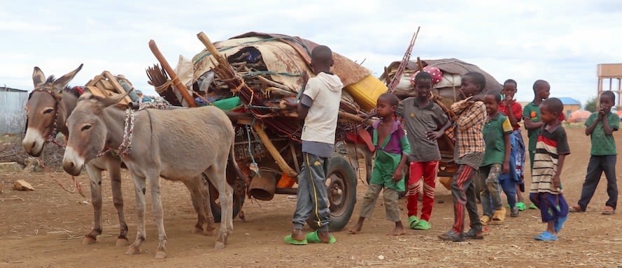 Children accompany their parents as they arrive in a new IDP settlement in Baidoa. Abdulkadir Mohamed/ NRC 2022.