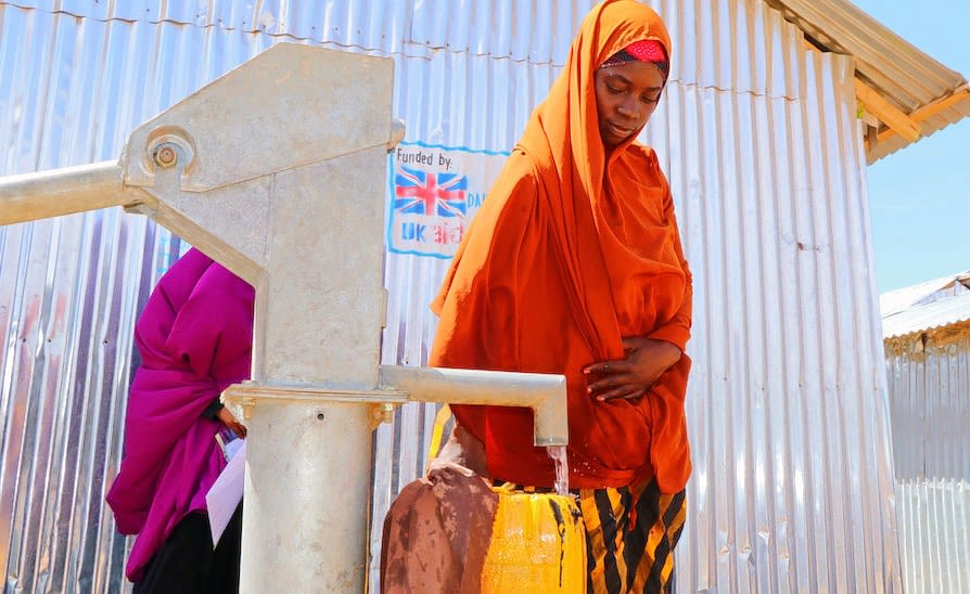 A woman in a displacement site in Kismayo fetches water from a water point. Abdulkadir Mohamed/ NRC 2021.